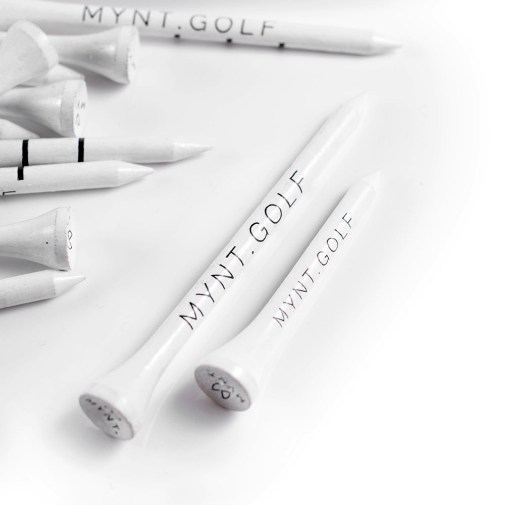 The MYNT Premium golf tees with a length of 83mm have guidelines printed on them so that you always know how high you need to tee your golf ball for a perfect shot.
